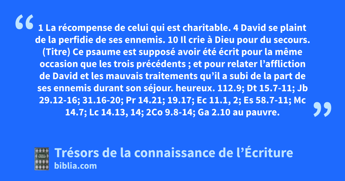 (Titre) Ce psaume est supposé avoir été écrit pour la même occasion que les trois précédents ; et pour relater l’affliction de David et les mauvais traitements qu’il a subi de la part de ses ennemis durant son séjour. heureux. 112.9; Dt 15.7-11; Jb 29.12-16; 31.16-20; Pr 14.21; 19.17; Ec 11.1, 2; Es 58.7-11; Mc 14.7; Lc 14.13, 14; 2Co 9.8-14; Ga 2.10 au pauvre. Ou : au faible, ou au malade. Mt 25.34-39; Ac 20.35; 1Th 5.14 au jour du malheur. 37.19; Pr 16.14; Ec 12.3; Ap 3.10 l’Éternel le délivre. 34.19; 37.26, 39, 40; Hé 6.10; Jc 2.13