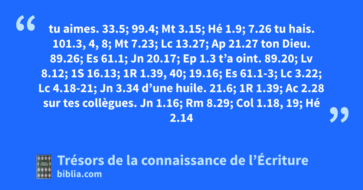 tu aimes. 33.5; 99.4; Mt 3.15; Hé 1.9; 7.26 tu hais. 101.3, 4, 8; Mt 7.23; Lc 13.27; Ap 21.27 ton Dieu. 89.26; Es 61.1; Jn 20.17; Ep 1.3 t’a oint. 89.20; Lv 8.12; 1S 16.13; 1R 1.39, 40; 19.16; Es 61.1-3; Lc 3.22; Lc 4.18-21; Jn 3.34 d’une huile. 21.6; 1R 1.39; Ac 2.28 sur tes collègues. Jn 1.16; Rm 8.29; Col 1.18, 19; Hé 2.14