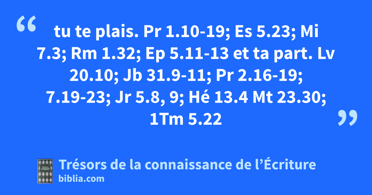 tu te plais. Pr 1.10-19; Es 5.23; Mi 7.3; Rm 1.32; Ep 5.11-13 et ta part. Lv 20.10; Jb 31.9-11; Pr 2.16-19; 7.19-23; Jr 5.8, 9; Hé 13.4 Mt 23.30; 1Tm 5.22