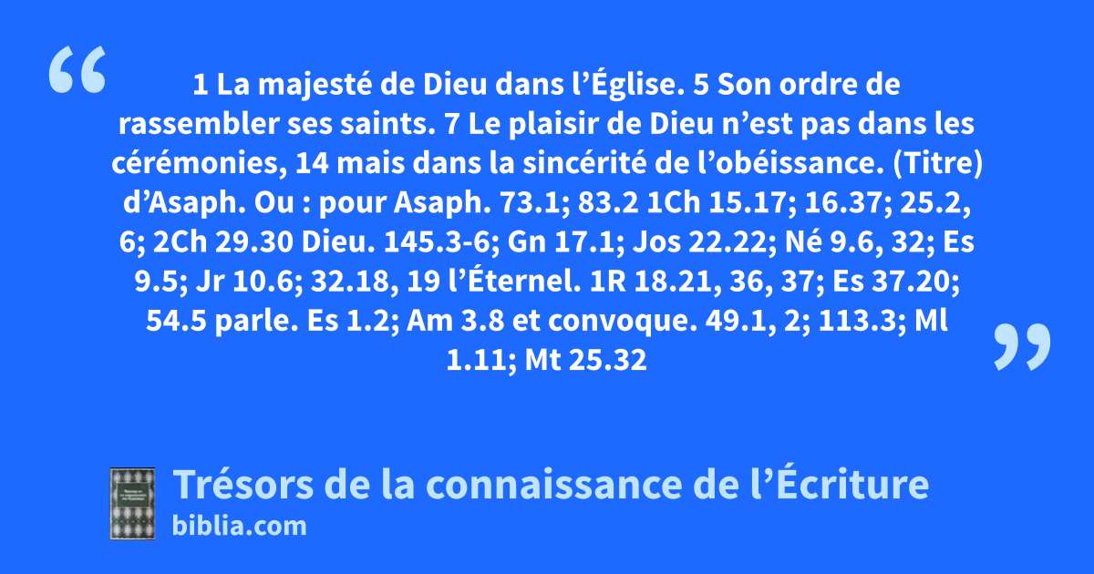 (Titre) d’Asaph. Ou : pour Asaph. 73.1; 83.2 1Ch 15.17; 16.37; 25.2, 6; 2Ch 29.30 Dieu. 145.3-6; Gn 17.1; Jos 22.22; Né 9.6, 32; Es 9.5; Jr 10.6; 32.18, 19 l’Éternel. 1R 18.21, 36, 37; Es 37.20; 54.5 parle. Es 1.2; Am 3.8 et convoque. 49.1, 2; 113.3; Ml 1.11; Mt 25.32