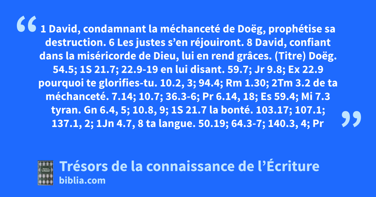 (Titre) Doëg. 54.5; 1S 21.7; 22.9-19 en lui disant. 59.7; Jr 9.8; Ex 22.9 pourquoi te glorifies-tu. 10.2, 3; 94.4; Rm 1.30; 2Tm 3.2 de ta méchanceté. 7.14; 10.7; 36.3-6; Pr 6.14, 18; Es 59.4; Mi 7.3 tyran. Gn 6.4, 5; 10.8, 9; 1S 21.7 la bonté. 103.17; 107.1; 137.1, 2; 1Jn 4.7, 8