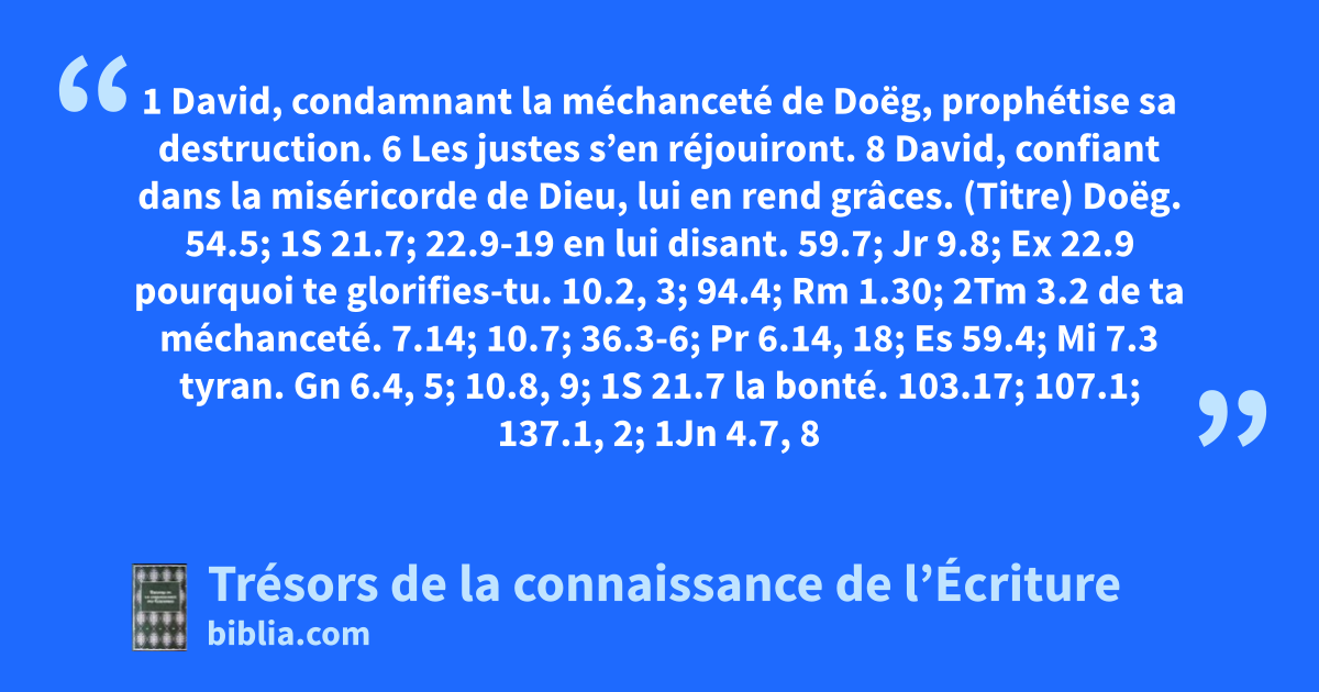 (Titre) Doëg. 54.5; 1S 21.7; 22.9-19 en lui disant. 59.7; Jr 9.8; Ex 22.9 pourquoi te glorifies-tu. 10.2, 3; 94.4; Rm 1.30; 2Tm 3.2 de ta méchanceté. 7.14; 10.7; 36.3-6; Pr 6.14, 18; Es 59.4; Mi 7.3 tyran. Gn 6.4, 5; 10.8, 9; 1S 21.7 la bonté. 103.17; 107.1; 137.1, 2; 1Jn 4.7, 8
