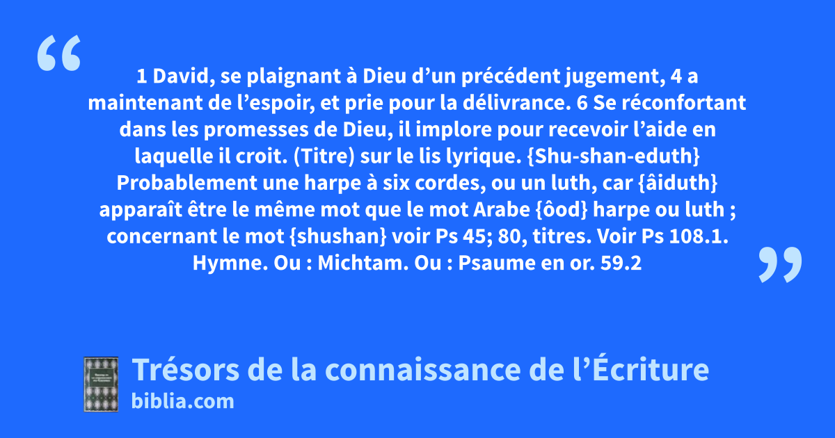 (Titre) sur le lis lyrique. {Shu-shan-eduth} Probablement une harpe à six cordes, ou un luth, car {âiduth} apparaît être le même mot que le mot Arabe {ôod} harpe ou luth ; concernant le mot {shushan} voir Ps 45; 80, titres. Voir Ps 108.1. Hymne. Ou : Michtam. Ou : Psaume en or. 59.2 lorsqu’il fit la guerre. 2S 8.3, 12, 13; 10.16; 1Ch 18.3, 12, 13; 19.16-19 dans la vallée. 2R 14.7; 2Ch 25.11 O Dieu. 10; 44.9; 74.1; 89.38; 108.11; 1Ch 28.9; Rm 11.1, 2 dispersés. Hébreu : brisés. 59.11; 1S 4.10, 11, 17; 13.6, 7, 11, 19-22; 31.1-7 relève-nous. 79.9; 89.3, 7, 19; 85.4; 90.13; Lm 3.31, 32; Za 10.6