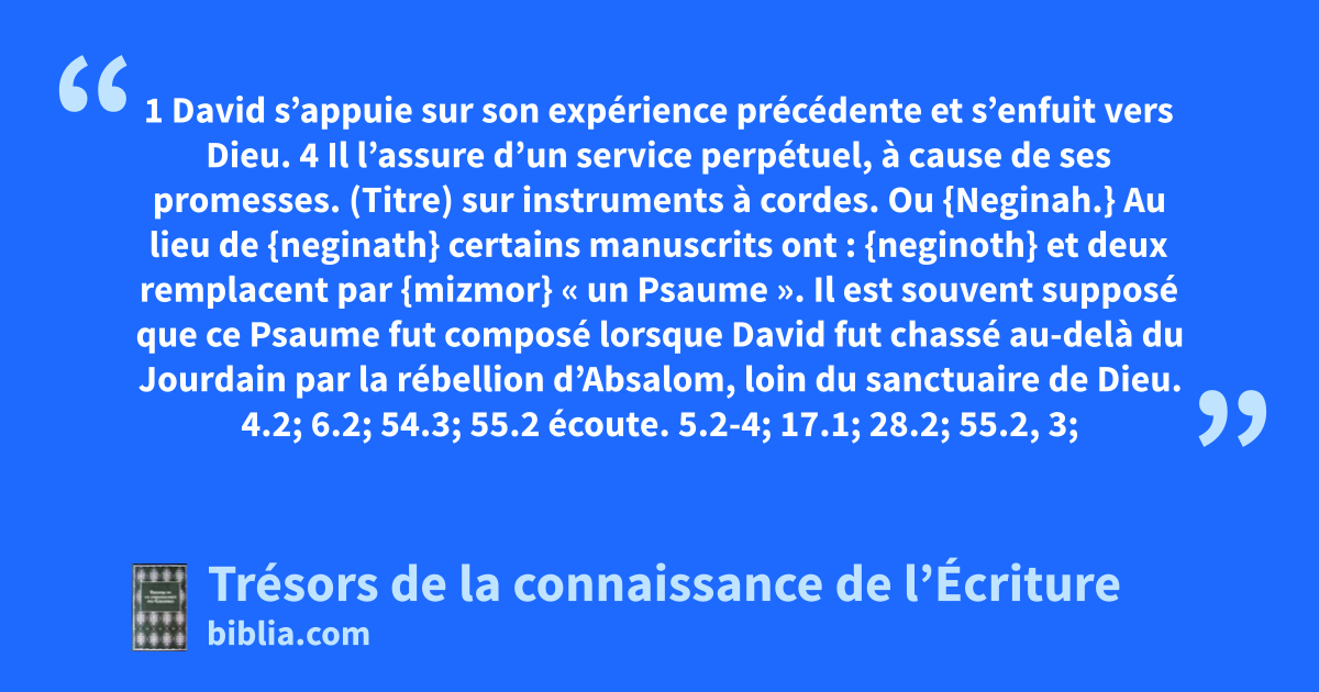 (Titre) sur instruments à cordes. Ou {Neginah.} Au lieu de {neginath} certains manuscrits ont : {neginoth} et deux remplacent par {mizmor} « un Psaume ». Il est souvent supposé que ce Psaume fut composé lorsque David fut chassé au-delà du Jourdain par la rébellion d’Absalom, loin du sanctuaire de Dieu. 4.2; 6.2; 54.3; 55.2 écoute. 5.2-4; 17.1; 28.2; 55.2, 3; 130.2; Ph 4.6