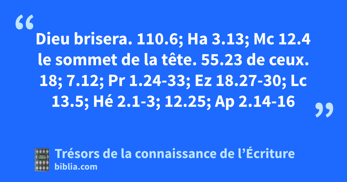 Dieu brisera. 110.6; Ha 3.13; Mc 12.4 le sommet de la tête. 55.23 de ceux. 18; 7.12; Pr 1.24-33; Ez 18.27-30; Lc 13.5; Hé 2.1-3; 12.25; Ap 2.14-16