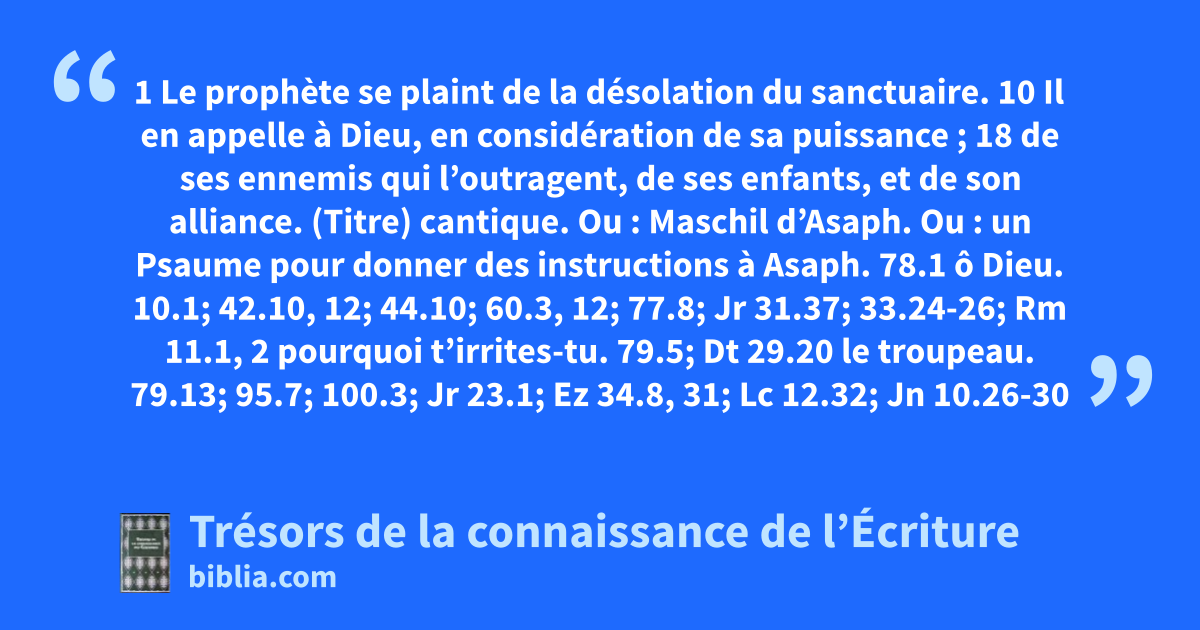 (Titre) cantique. Ou : Maschil d’Asaph. Ou : un Psaume pour donner des instructions à Asaph. 78.1 ô Dieu. 10.1; 42.10, 12; 44.10; 60.3, 12; 77.8; Jr 31.37; 33.24-26; Rm 11.1, 2 pourquoi t’irrites-tu. 79.5; Dt 29.20 le troupeau. 79.13; 95.7; 100.3; Jr 23.1; Ez 34.8, 31; Lc 12.32; Jn 10.26-30