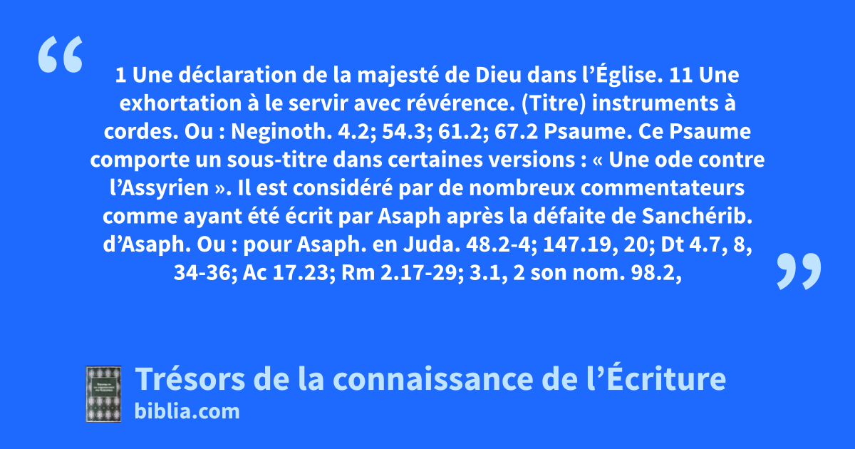 (Titre) instruments à cordes. Ou : Neginoth. 4.2; 54.3; 61.2; 67.2 Psaume. Ce Psaume comporte un sous-titre dans certaines versions : « Une ode contre l’Assyrien ». Il est considéré par de nombreux commentateurs comme ayant été écrit par Asaph après la défaite de Sanchérib. d’Asaph. Ou : pour Asaph. en Juda. 48.2-4; 147.19, 20; Dt 4.7, 8, 34-36; Ac 17.23; Rm 2.17-29; 3.1, 2 son nom. 98.2, 3; 148.13, 14; 1Ch 29.10-12; 2Ch 2.5, 6; Dn 3.29; 4.1, 2