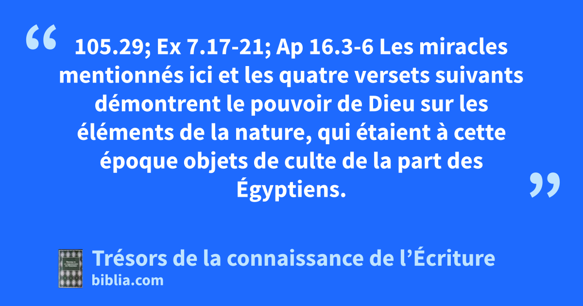 105.29; Ex 7.17-21; Ap 16.3-6 Les miracles mentionnés ici et les quatre versets suivants démontrent le pouvoir de Dieu sur les éléments de la nature, qui étaient à cette époque objets de culte de la part des Égyptiens.