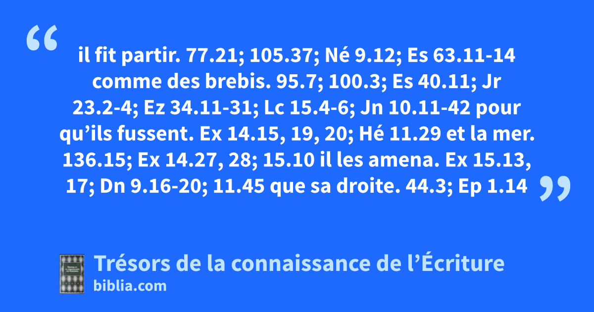 il fit partir. 77.21; 105.37; Né 9.12; Es 63.11-14 comme des brebis. 95.7; 100.3; Es 40.11; Jr 23.2-4; Ez 34.11-31; Lc 15.4-6; Jn 10.11-42