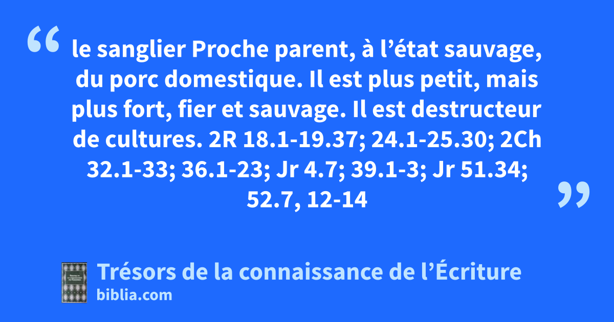 le sanglier Proche parent, à l’état sauvage, du porc domestique. Il est plus petit, mais plus fort, fier et sauvage. Il est destructeur de cultures. 2R 18.1-19.37; 24.1-25.30; 2Ch 32.1-33; 36.1-23; Jr 4.7; 39.1-3; Jr 51.34; 52.7, 12-14