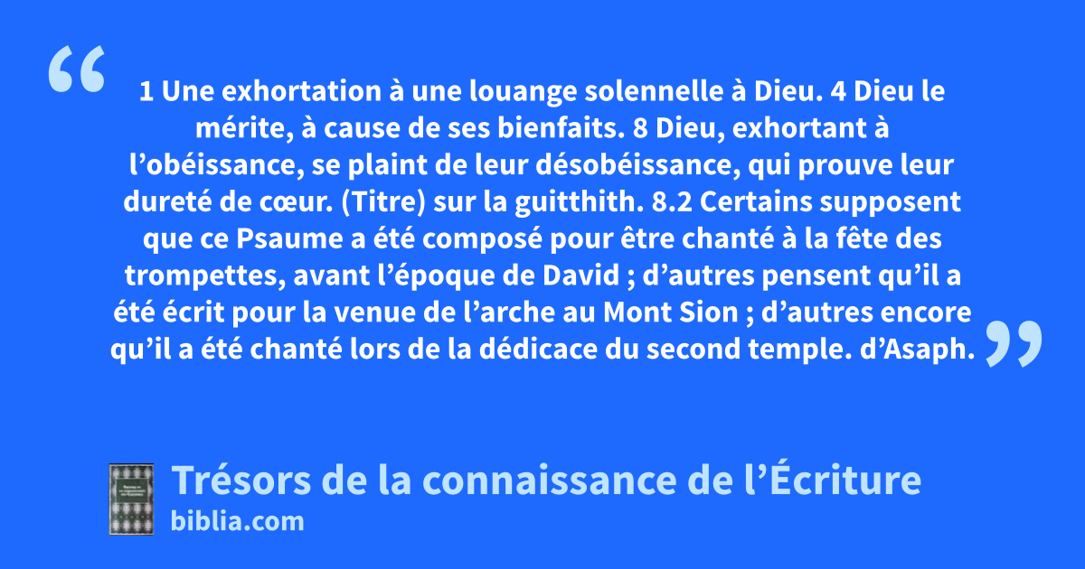 (Titre) sur la guitthith. 8.2 Certains supposent que ce Psaume a été composé pour être chanté à la fête des trompettes, avant l’époque de David ; d’autres pensent qu’il a été écrit pour la venue de l’arche au Mont Sion ; d’autres encore qu’il a été chanté lors de la dédicace du second temple. d’Asaph. Ou : pour Asaph. chantez. 67.5; Jr 31.7 notre force. 18.1, 2; 28.7; 52.7; Ph 4.13 poussez des cris de joie. 33.1-3; 46.1-7; 66.1; 100.1, 2 le Dieu. 46.11; Gn 50.17; Mt 22.32