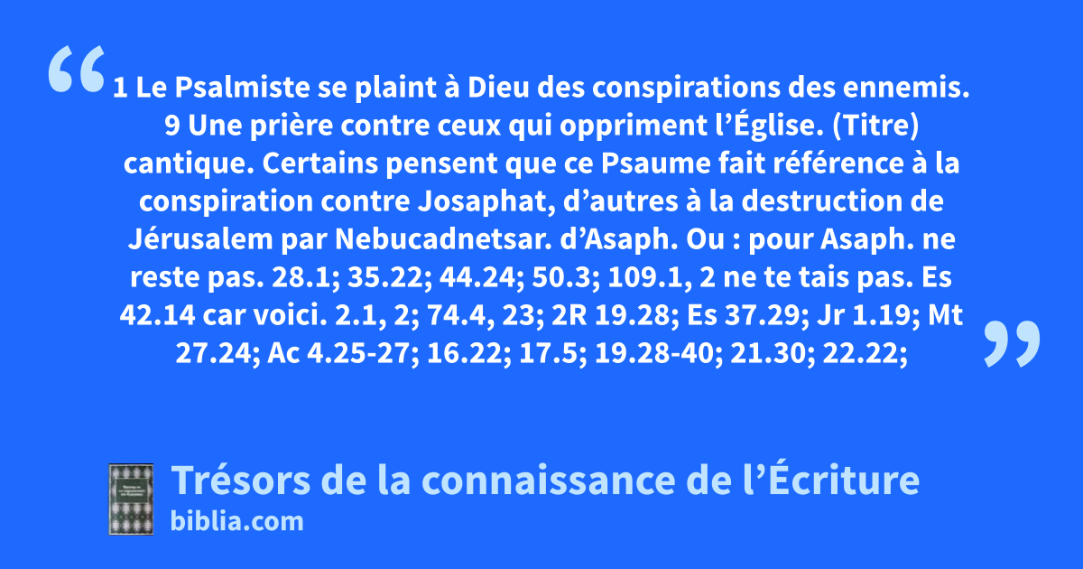 (Titre) cantique. Certains pensent que ce Psaume fait référence à la conspiration contre Josaphat, d’autres à la destruction de Jérusalem par Nebucadnetsar. d’Asaph. Ou : pour Asaph. ne reste pas. 28.1; 35.22; 44.24; 50.3; 109.1, 2 ne te tais pas. Es 42.14