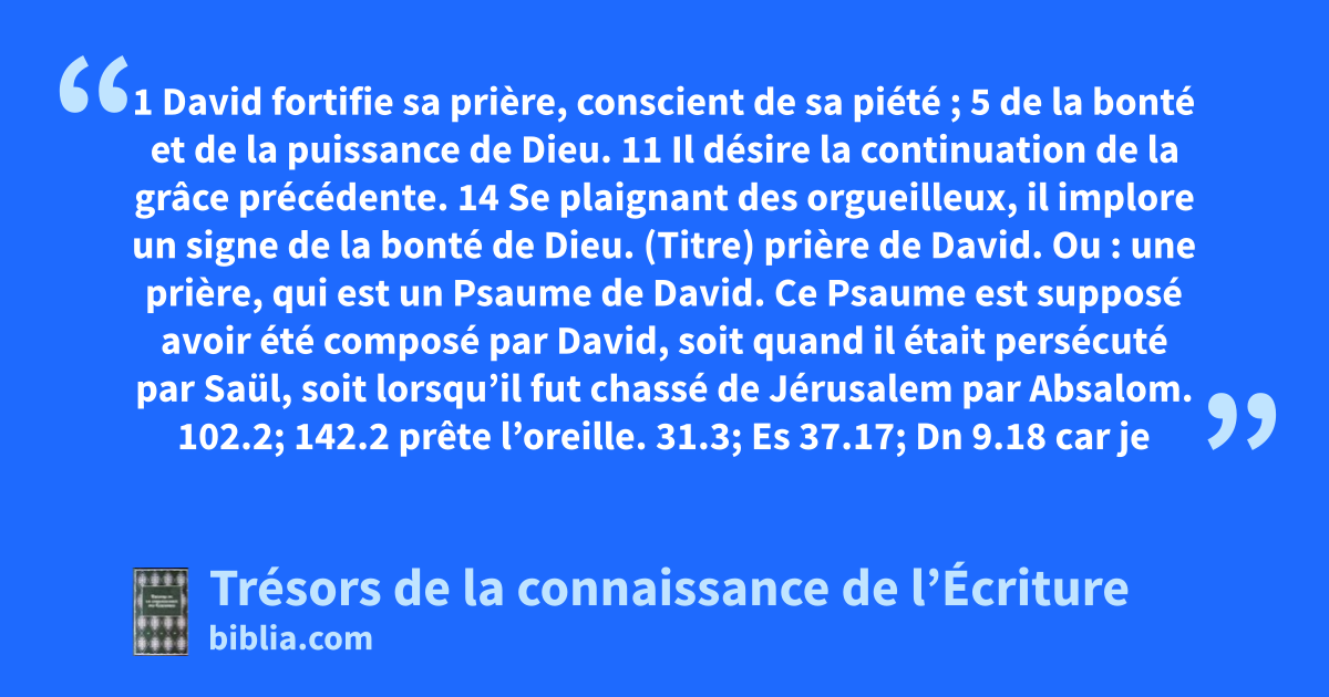 1 David fortifie sa prière, conscient de sa piété ; 5 de la bonté et de la puissance de Dieu. 11 Il désire la continuation de la grâce précédente. 14 Se plaignant des orgueilleux, il implore un signe de la bonté de Dieu.