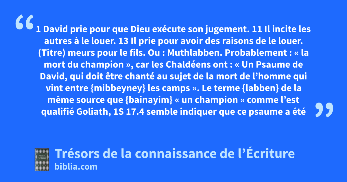 (Titre) meurs pour le fils. Ou : Muthlabben. Probablement : « la mort du champion », car les Chaldéens ont : « Un Psaume de David, qui doit être chanté au sujet de la mort de l’homme qui vint entre {mibbeyney} les camps ». Le terme {labben} de la même source que {bainayim} « un champion » comme l’est qualifié Goliath, 1S 17.4 semble indiquer que ce psaume a été composé au sujet de la défaite de Goliath. je louerai. 7.17; 34.1-4; 103.1, 2; 145.1-3; 146.1, 2; 1Ch 29.10-13; Es 12.1; Hé 13.15; Ap 5.9-14 de tout mon cœur. 86.12; 111.1; 138.1; Lc 10.27 je raconterai. 14; 51.15; 106.2; 1Ch 16.12, 24; Es 43.21; 60.6; Ap 15.3