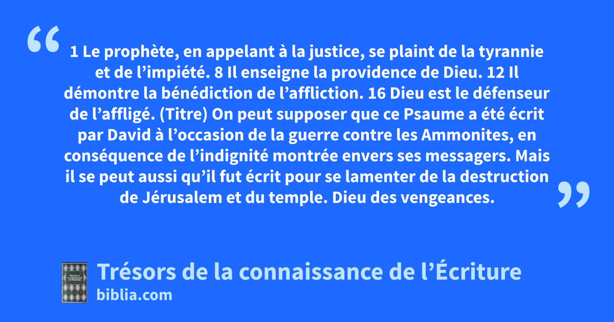 (Titre) On peut supposer que ce Psaume a été écrit par David à l’occasion de la guerre contre les Ammonites, en conséquence de l’indignité montrée envers ses messagers. Mais il se peut aussi qu’il fut écrit pour se lamenter de la destruction de Jérusalem et du temple. Dieu des vengeances. Éternel. Dt 32.35, 41, 42; Es 35.4; 59.17; Jr 50.28; Na 1.2; Rm 12.19 2Th 1.8; Hé 10.30 parais. 80.1