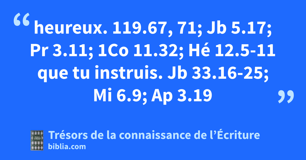 heureux. 119.67, 71; Jb 5.17; Pr 3.11; 1Co 11.32; Hé 12.5-11 que tu instruis. Jb 33.16-25; Mi 6.9; Ap 3.19
