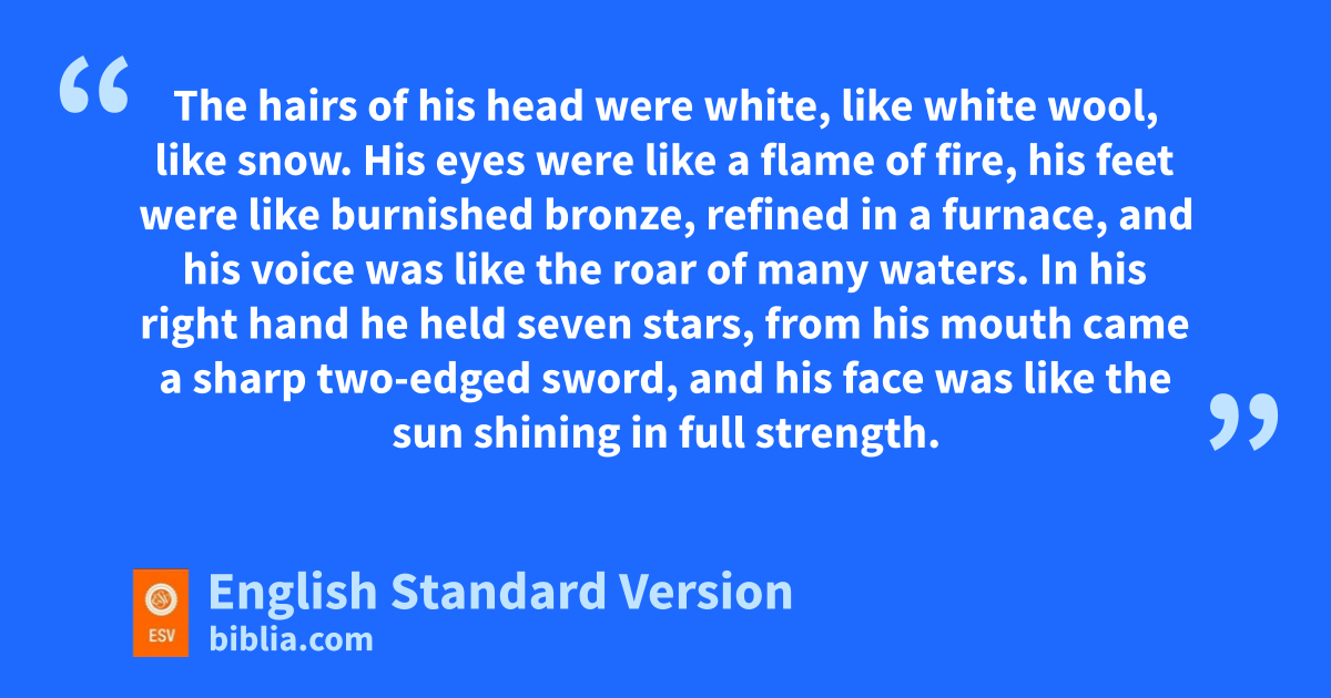 12 Then I turned to see the voice that was speaking to me, and on turning I saw iseven golden lampstands, 13 and in the midst of the lampstands jone like ka son of man, lclothed with a long robe and mwith a golden sash around his chest. 14 nThe hairs of his head were white, like white wool, like snow. oHis eyes were like a flame of fire, 15 phis feet were like burnished bronze, refined in a furnace, and qhis voice was like the roar of many waters. 16 rIn his right hand he held seven stars, sfrom his mouth came a sharp two-edged sword, and this face was like the sun shining uin full strength.