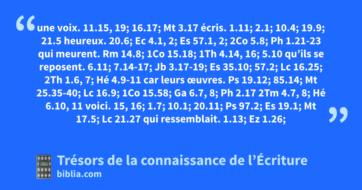 une voix. 11.15, 19; 16.17; Mt 3.17 écris. 1.11; 2.1; 10.4; 19.9; 21.5 heureux. 20.6; Ec 4.1, 2; Es 57.1, 2; 2Co 5.8; Ph 1.21-23 qui meurent. Rm 14.8; 1Co 15.18; 1Th 4.14, 16; 5.10 qu’ils se reposent. 6.11; 7.14-17; Jb 3.17-19; Es 35.10; 57.2; Lc 16.25; 2Th 1.6, 7; Hé 4.9-11 car leurs œuvres. Ps 19.12; 85.14; Mt 25.35-40; Lc 16.9; 1Co 15.58; Ga 6.7, 8; Ph 2.17 2Tm 4.7, 8; Hé 6.10, 11