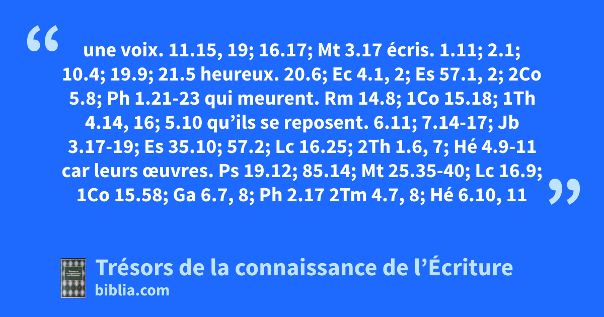 une voix. 11.15, 19; 16.17; Mt 3.17 écris. 1.11; 2.1; 10.4; 19.9; 21.5 heureux. 20.6; Ec 4.1, 2; Es 57.1, 2; 2Co 5.8; Ph 1.21-23 qui meurent. Rm 14.8; 1Co 15.18; 1Th 4.14, 16; 5.10 qu’ils se reposent. 6.11; 7.14-17; Jb 3.17-19; Es 35.10; 57.2; Lc 16.25; 2Th 1.6, 7; Hé 4.9-11 car leurs œuvres. Ps 19.12; 85.14; Mt 25.35-40; Lc 16.9; 1Co 15.58; Ga 6.7, 8; Ph 2.17 2Tm 4.7, 8; Hé 6.10, 11