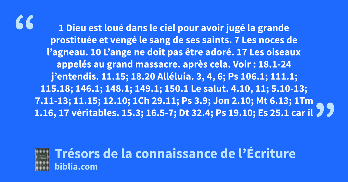 après cela. Voir : 18.1-24 j’entendis. 11.15; 18.20 Alléluia. 3, 4, 6; Ps 106.1; 111.1; 115.18; 146.1; 148.1; 149.1; 150.1 Le salut. 4.10, 11; 5.10-13; 7.11-13; 11.15; 12.10; 1Ch 29.11; Ps 3.9; Jon 2.10; Mt 6.13; 1Tm 1.16, 17