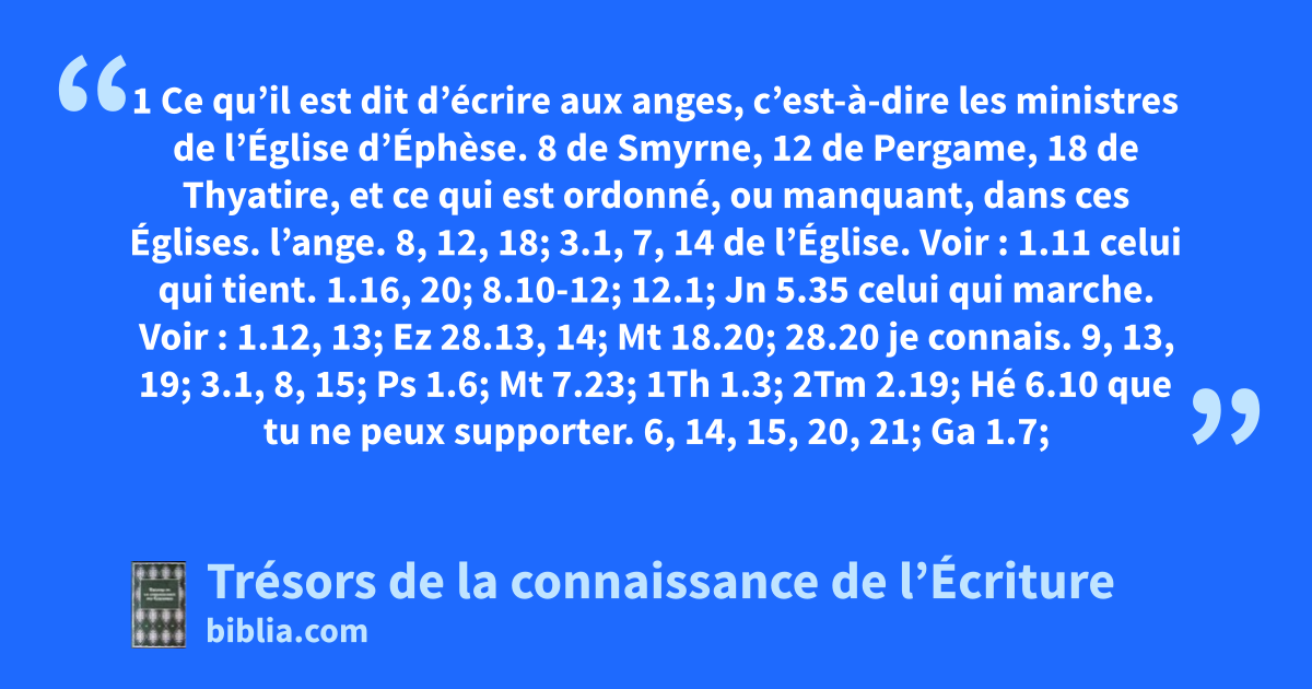 1 Ce qu’il est dit d’écrire aux anges, c’est-à-dire les ministres de l’Église d’Éphèse. 8 de Smyrne, 12 de Pergame, 18 de Thyatire, et ce qui est ordonné, ou manquant, dans ces Églises.