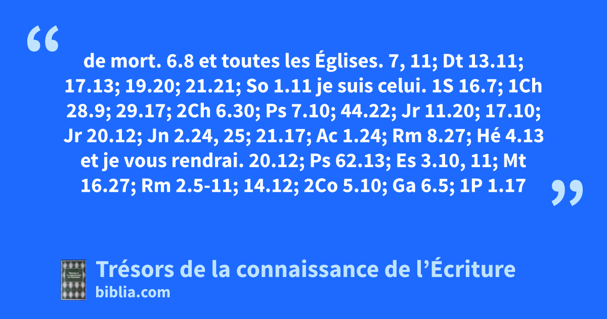 de mort. 6.8 et toutes les Églises. 7, 11; Dt 13.11; 17.13; 19.20; 21.21; So 1.11 je suis celui. 1S 16.7; 1Ch 28.9; 29.17; 2Ch 6.30; Ps 7.10; 44.22; Jr 11.20; 17.10; Jr 20.12; Jn 2.24, 25; 21.17; Ac 1.24; Rm 8.27; Hé 4.13 et je vous rendrai. 20.12; Ps 62.13; Es 3.10, 11; Mt 16.27; Rm 2.5-11; 14.12; 2Co 5.10; Ga 6.5; 1P 1.17