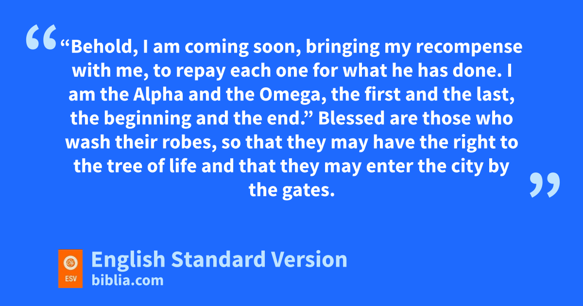 12 “Behold, vI am coming soon, wbringing my recompense with me, xto repay each one for what he has done. 13 yI am the Alpha and the Omega, zthe first and the last, athe beginning and the end.”