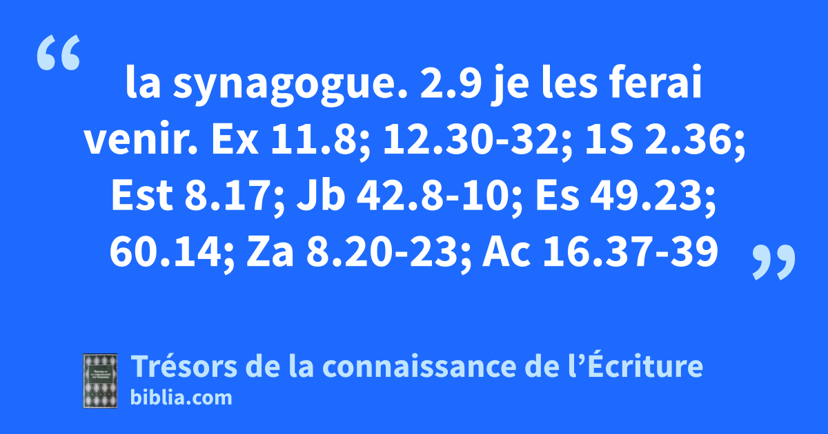 la synagogue. 2.9 je les ferai venir. Ex 11.8; 12.30-32; 1S 2.36; Est 8.17; Jb 42.8-10; Es 49.23; 60.14; Za 8.20-23; Ac 16.37-39