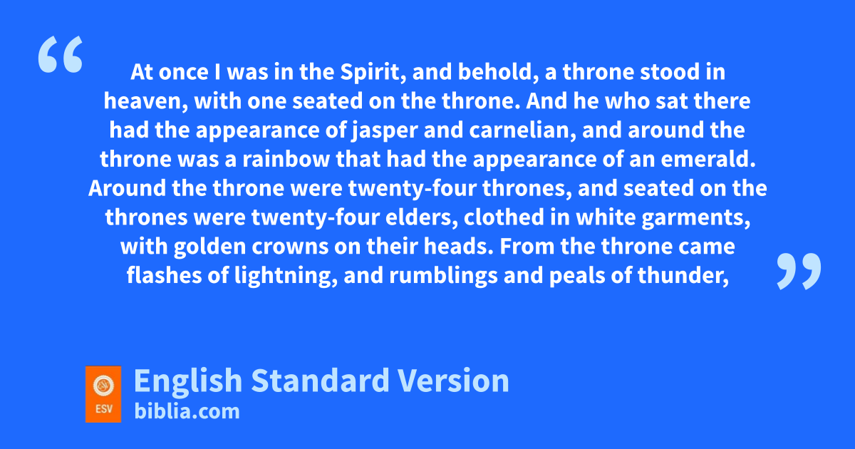 4 After this I looked, and behold, a door standing open in heaven! And the first voice, which I had heard speaking to me flike a trumpet, said, g“Come up here, and hI will show you what must take place after this.” 2 At once iI was in the Spirit, and behold, ja throne stood in heaven, with one seated on the throne. 3 And he who sat there had the appearance of kjasper and carnelian, and around the throne was la rainbow that had the appearance of an emerald. 4 Around the throne were mtwenty-four thrones, and seated on the thrones were twenty-four elders, nclothed in white garments, with ogolden crowns on their heads. 5 From the throne came pflashes of lightning, and rumblings1 and peals of thunder, and before the throne were burning qseven torches of fire, rwhich are the seven spirits of God, 6 and before the throne there was sas it were a sea of glass, like crystal.