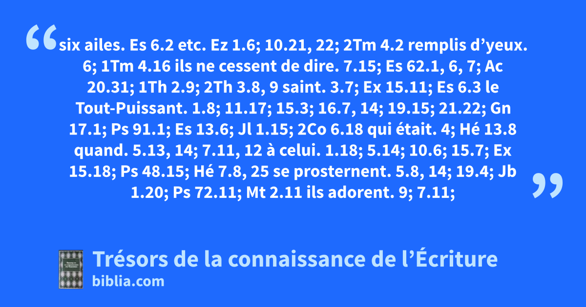 six ailes. Es 6.2 etc. Ez 1.6; 10.21, 22; 2Tm 4.2 remplis d’yeux. 6; 1Tm 4.16 ils ne cessent de dire. 7.15; Es 62.1, 6, 7; Ac 20.31; 1Th 2.9; 2Th 3.8, 9 saint. 3.7; Ex 15.11; Es 6.3 le Tout-Puissant. 1.8; 11.17; 15.3; 16.7, 14; 19.15; 21.22; Gn 17.1; Ps 91.1; Es 13.6; Jl 1.15; 2Co 6.18 qui était. 4; Hé 13.8