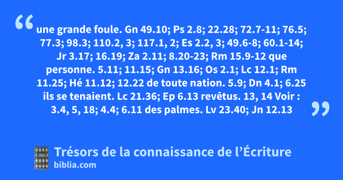 une grande foule. Gn 49.10; Ps 2.8; 22.28; 72.7-11; 76.5; 77.3; 98.3; 110.2, 3; 117.1, 2; Es 2.2, 3; 49.6-8; 60.1-14; Jr 3.17; 16.19; Za 2.11; 8.20-23; Rm 15.9-12 que personne. 5.11; 11.15; Gn 13.16; Os 2.1; Lc 12.1; Rm 11.25; Hé 11.12; 12.22 de toute nation. 5.9; Dn 4.1; 6.25 ils se tenaient. Lc 21.36; Ep 6.13 revêtus. 13, 14 Voir : 3.4, 5, 18; 4.4; 6.11 des palmes. Lv 23.40; Jn 12.13