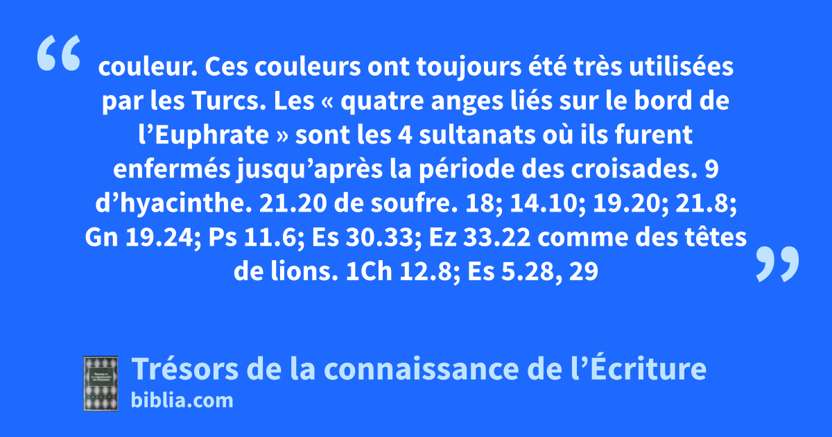 couleur. Ces couleurs ont toujours été très utilisées par les Turcs. Les « quatre anges liés sur le bord de l’Euphrate » sont les 4 sultanats où ils furent enfermés jusqu’après la période des croisades. 9 d’hyacinthe. 21.20 de soufre. 18; 14.10; 19.20; 21.8; Gn 19.24; Ps 11.6; Es 30.33; Ez 33.22 comme des têtes de lions. 1Ch 12.8; Es 5.28, 29