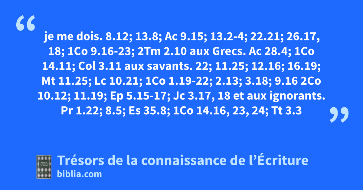 je me dois. 8.12; 13.8; Ac 9.15; 13.2-4; 22.21; 26.17, 18; 1Co 9.16-23; 2Tm 2.10 aux Grecs. Ac 28.4; 1Co 14.11; Col 3.11 aux savants. 22; 11.25; 12.16; 16.19; Mt 11.25; Lc 10.21; 1Co 1.19-22; 2.13; 3.18; 9.16 2Co 10.12; 11.19; Ep 5.15-17; Jc 3.17, 18 et aux ignorants. Pr 1.22; 8.5; Es 35.8; 1Co 14.16, 23, 24; Tt 3.3
