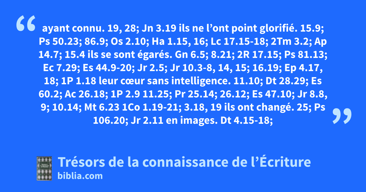 ayant connu. 19, 28; Jn 3.19 ils ne l’ont point glorifié. 15.9; Ps 50.23; 86.9; Os 2.10; Ha 1.15, 16; Lc 17.15-18; 2Tm 3.2; Ap 14.7; 15.4 ils se sont égarés. Gn 6.5; 8.21; 2R 17.15; Ps 81.13; Ec 7.29; Es 44.9-20; Jr 2.5; Jr 10.3-8, 14, 15; 16.19; Ep 4.17, 18; 1P 1.18 leur cœur sans intelligence. 11.10; Dt 28.29; Es 60.2; Ac 26.18; 1P 2.9
