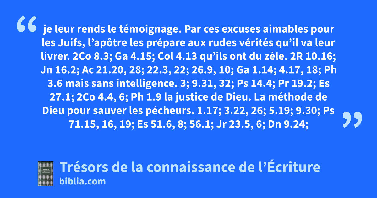 je leur rends le témoignage. Par ces excuses aimables pour les Juifs, l’apôtre les prépare aux rudes vérités qu’il va leur livrer. 2Co 8.3; Ga 4.15; Col 4.13 qu’ils ont du zèle. 2R 10.16; Jn 16.2; Ac 21.20, 28; 22.3, 22; 26.9, 10; Ga 1.14; 4.17, 18; Ph 3.6 mais sans intelligence. 3; 9.31, 32; Ps 14.4; Pr 19.2; Es 27.1; 2Co 4.4, 6; Ph 1.9