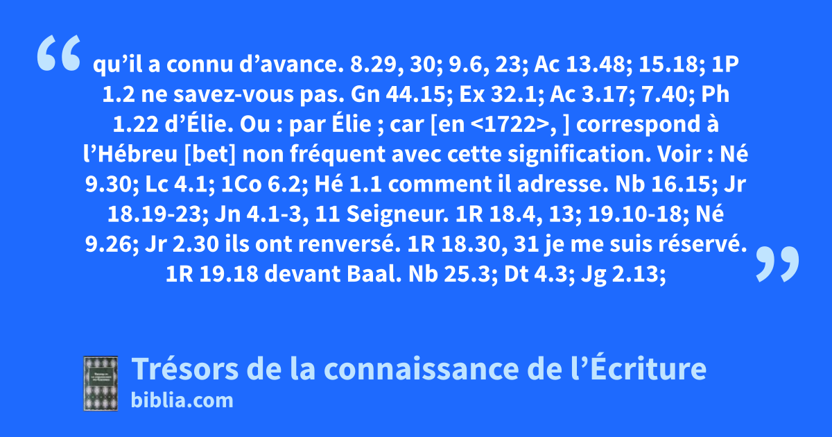 qu’il a connu d’avance. 8.29, 30; 9.6, 23; Ac 13.48; 15.18; 1P 1.2 ne savez-vous pas. Gn 44.15; Ex 32.1; Ac 3.17; 7.40; Ph 1.22 d’Élie. Ou : par Élie ; car [en <1722>, ] correspond à l’Hébreu [bet] non fréquent avec cette signification. Voir : Né 9.30; Lc 4.1; 1Co 6.2; Hé 1.1 comment il adresse. Nb 16.15; Jr 18.19-23; Jn 4.1-3, 11