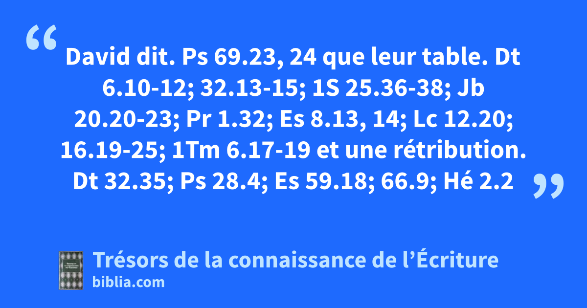 David dit. Ps 69.23, 24 que leur table. Dt 6.10-12; 32.13-15; 1S 25.36-38; Jb 20.20-23; Pr 1.32; Es 8.13, 14; Lc 12.20; 16.19-25; 1Tm 6.17-19 et une rétribution. Dt 32.35; Ps 28.4; Es 59.18; 66.9; Hé 2.2