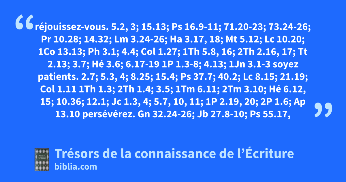 réjouissez-vous. 5.2, 3; 15.13; Ps 16.9-11; 71.20-23; 73.24-26; Pr 10.28; 14.32; Lm 3.24-26; Ha 3.17, 18; Mt 5.12; Lc 10.20; 1Co 13.13; Ph 3.1; 4.4; Col 1.27; 1Th 5.8, 16; 2Th 2.16, 17; Tt 2.13; 3.7; Hé 3.6; 6.17-19 1P 1.3-8; 4.13; 1Jn 3.1-3 soyez patients. 2.7; 5.3, 4; 8.25; 15.4; Ps 37.7; 40.2; Lc 8.15; 21.19; Col 1.11 1Th 1.3; 2Th 1.4; 3.5; 1Tm 6.11; 2Tm 3.10; Hé 6.12, 15; 10.36; 12.1; Jc 1.3, 4; 5.7, 10, 11; 1P 2.19, 20; 2P 1.6; Ap 13.10 persévérez. Gn 32.24-26; Jb 27.8-10; Ps 55.17, 18; 62.9; 109.4; Jr 29.12, 13; Dn 9.18, 19; Lc 11.5-13; 18.1-8 etc. Ac 1.14; 2.42; 6.4; 12.5; 2Co 12.8; Ep 6.18, 19; Ph 4.6, 7; Col 4.2, 12; 1Th 5.17; Hé 5.7; Jc 5.15, 16; 1P 4.7; 1Jn 5.14, 15