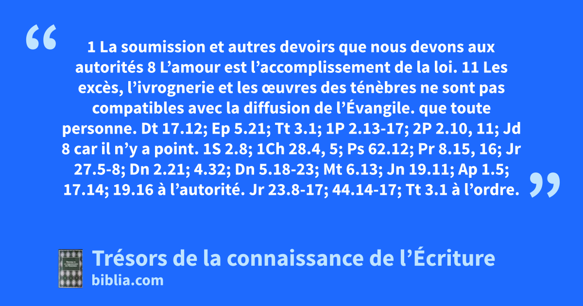 que toute personne. Dt 17.12; Ep 5.21; Tt 3.1; 1P 2.13-17; 2P 2.10, 11; Jd 8 car il n’y a point. 1S 2.8; 1Ch 28.4, 5; Ps 62.12; Pr 8.15, 16; Jr 27.5-8; Dn 2.21; 4.32; Dn 5.18-23; Mt 6.13; Jn 19.11; Ap 1.5; 17.14; 19.16