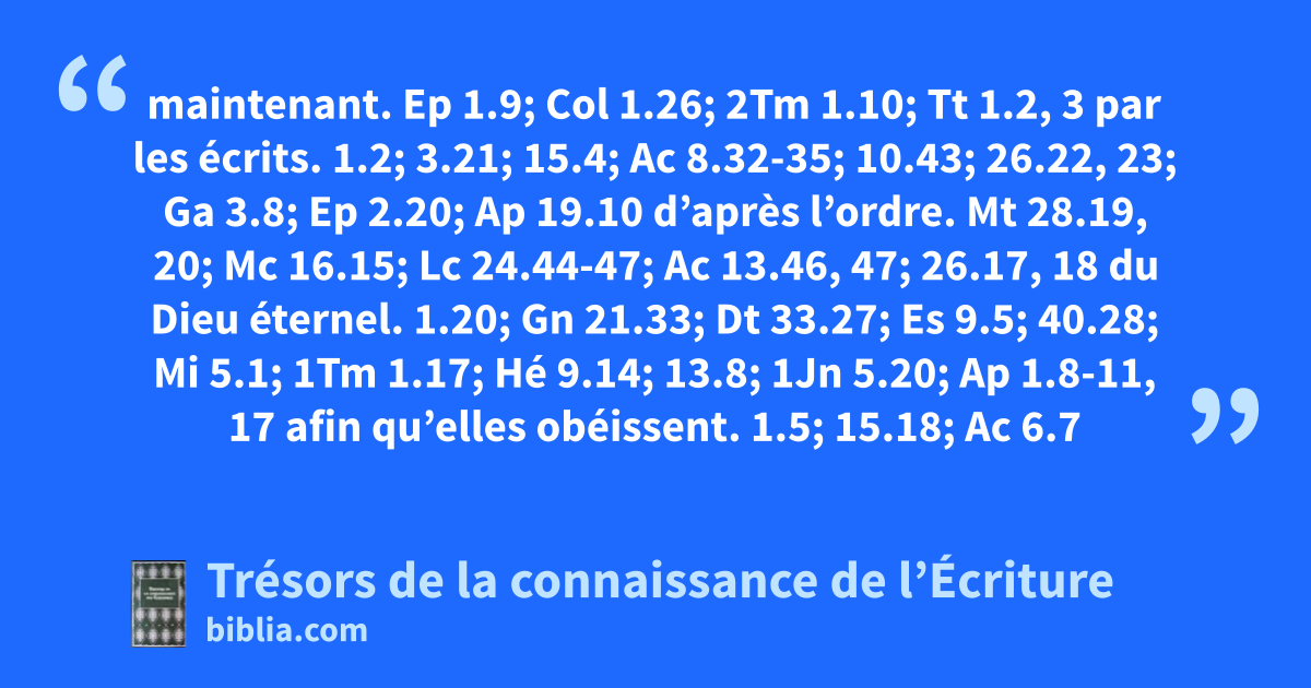 maintenant. Ep 1.9; Col 1.26; 2Tm 1.10; Tt 1.2, 3 par les écrits. 1.2; 3.21; 15.4; Ac 8.32-35; 10.43; 26.22, 23; Ga 3.8; Ep 2.20; Ap 19.10 d’après l’ordre. Mt 28.19, 20; Mc 16.15; Lc 24.44-47; Ac 13.46, 47; 26.17, 18 du Dieu éternel. 1.20; Gn 21.33; Dt 33.27; Es 9.5; 40.28; Mi 5.1; 1Tm 1.17; Hé 9.14; 13.8; 1Jn 5.20; Ap 1.8-11, 17 afin qu’elles obéissent. 1.5; 15.18; Ac 6.7