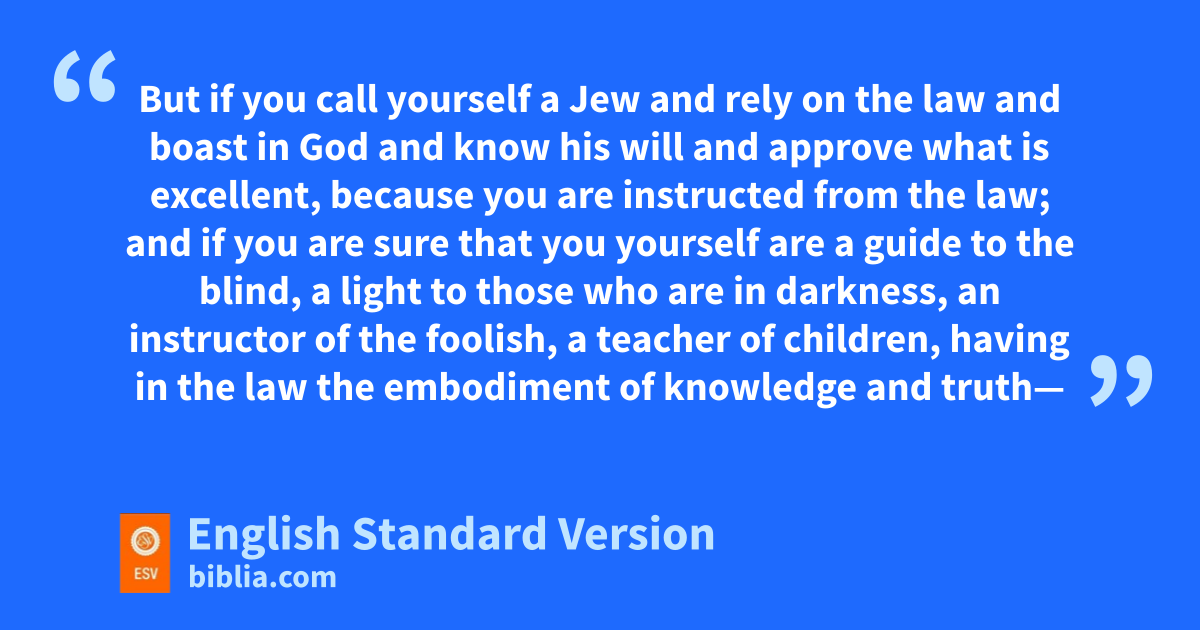 17 But if you call yourself a Jew and drely on the law and boast in God 18 and know his will and approve what is excellent, because you are instructed from the law; 19 and if you are sure that you yourself are ea guide to the blind, a light to those who are in darkness, 20 an instructor of the foolish, a teacher of children, having in the law fthe embodiment of gknowledge and truth— 21 hyou then who teach others, do you not teach yourself? While you preach against stealing, do you steal? 22 You who say that one must not commit adultery, do you commit adultery? You who abhor idols, do you irob temples? 23 You who jboast in the law kdishonor God by breaking the law. 24 For, las it is written, “The name of God is blasphemed mamong the Gentiles because of you.”
