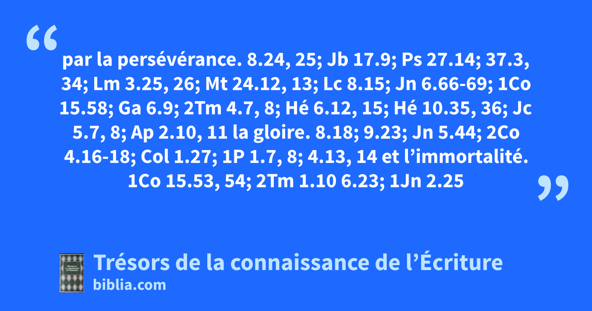 par la persévérance. 8.24, 25; Jb 17.9; Ps 27.14; 37.3, 34; Lm 3.25, 26; Mt 24.12, 13; Lc 8.15; Jn 6.66-69; 1Co 15.58; Ga 6.9; 2Tm 4.7, 8; Hé 6.12, 15; Hé 10.35, 36; Jc 5.7, 8; Ap 2.10, 11 la gloire. 8.18; 9.23; Jn 5.44; 2Co 4.16-18; Col 1.27; 1P 1.7, 8; 4.13, 14 et l’immortalité. 1Co 15.53, 54; 2Tm 1.10 6.23; 1Jn 2.25