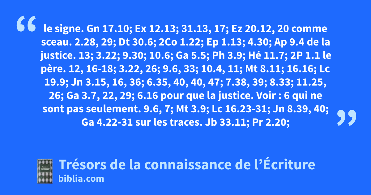 le signe. Gn 17.10; Ex 12.13; 31.13, 17; Ez 20.12, 20 comme sceau. 2.28, 29; Dt 30.6; 2Co 1.22; Ep 1.13; 4.30; Ap 9.4 de la justice. 13; 3.22; 9.30; 10.6; Ga 5.5; Ph 3.9; Hé 11.7; 2P 1.1 le père. 12, 16-18; 3.22, 26; 9.6, 33; 10.4, 11; Mt 8.11; 16.16; Lc 19.9; Jn 3.15, 16, 36; 6.35, 40, 40, 47; 7.38, 39; 8.33; 11.25, 26; Ga 3.7, 22, 29; 6.16 pour que la justice. Voir : 6