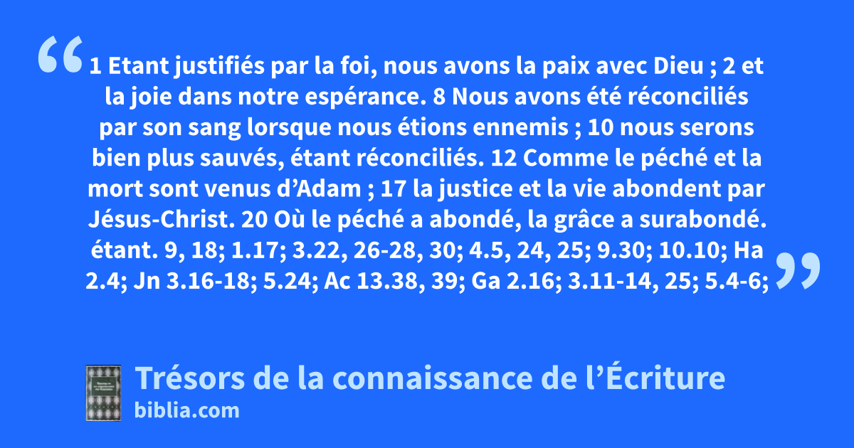 1 Etant justifiés par la foi, nous avons la paix avec Dieu ; 2 et la joie dans notre espérance. 8 Nous avons été réconciliés par son sang lorsque nous étions ennemis ; 10 nous serons bien plus sauvés, étant réconciliés. 12 Comme le péché et la mort sont venus d’Adam ; 17 la justice et la vie abondent par Jésus-Christ. 20 Où le péché a abondé, la grâce a surabondé.
