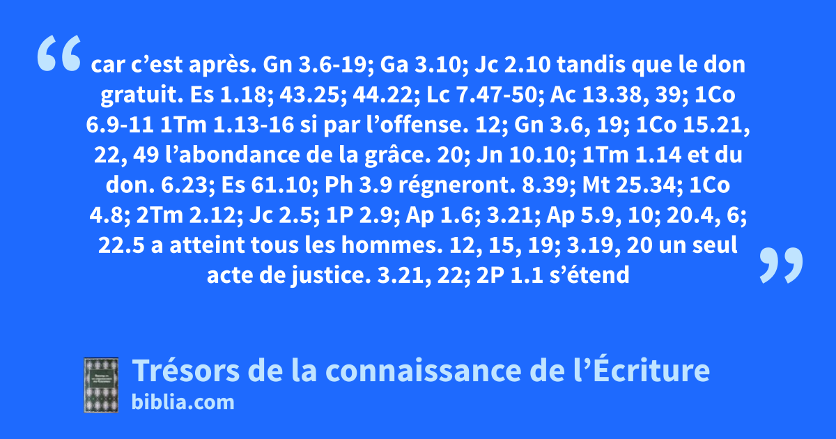 car c’est après. Gn 3.6-19; Ga 3.10; Jc 2.10 tandis que le don gratuit. Es 1.18; 43.25; 44.22; Lc 7.47-50; Ac 13.38, 39; 1Co 6.9-11 1Tm 1.13-16