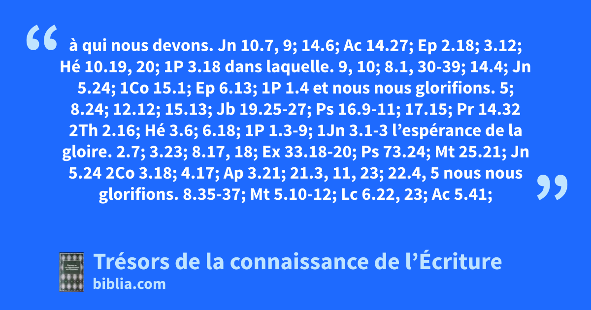 à qui nous devons. Jn 10.7, 9; 14.6; Ac 14.27; Ep 2.18; 3.12; Hé 10.19, 20; 1P 3.18 dans laquelle. 9, 10; 8.1, 30-39; 14.4; Jn 5.24; 1Co 15.1; Ep 6.13; 1P 1.4 et nous nous glorifions. 5; 8.24; 12.12; 15.13; Jb 19.25-27; Ps 16.9-11; 17.15; Pr 14.32 2Th 2.16; Hé 3.6; 6.18; 1P 1.3-9; 1Jn 3.1-3 l’espérance de la gloire. 2.7; 3.23; 8.17, 18; Ex 33.18-20; Ps 73.24; Mt 25.21; Jn 5.24 2Co 3.18; 4.17; Ap 3.21; 21.3, 11, 23; 22.4, 5