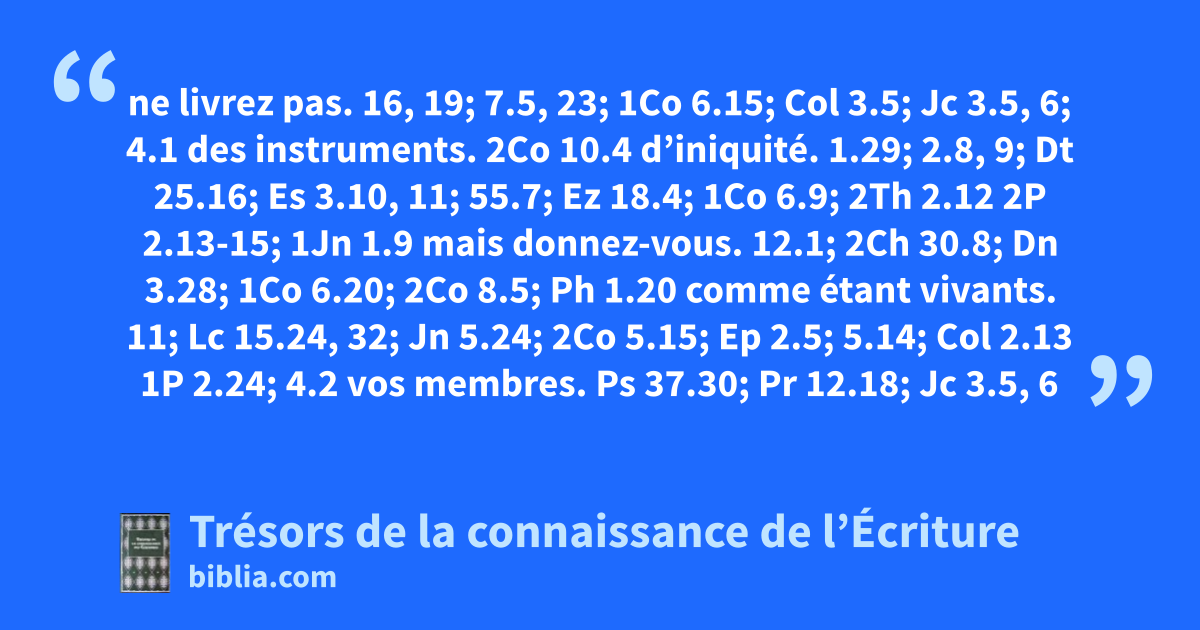 ne livrez pas. 16, 19; 7.5, 23; 1Co 6.15; Col 3.5; Jc 3.5, 6; 4.1 des instruments. 2Co 10.4 d’iniquité. 1.29; 2.8, 9; Dt 25.16; Es 3.10, 11; 55.7; Ez 18.4; 1Co 6.9; 2Th 2.12 2P 2.13-15; 1Jn 1.9 mais donnez-vous. 12.1; 2Ch 30.8; Dn 3.28; 1Co 6.20; 2Co 8.5; Ph 1.20 comme étant vivants. 11; Lc 15.24, 32; Jn 5.24; 2Co 5.15; Ep 2.5; 5.14; Col 2.13 1P 2.24; 4.2 vos membres. Ps 37.30; Pr 12.18; Jc 3.5, 6