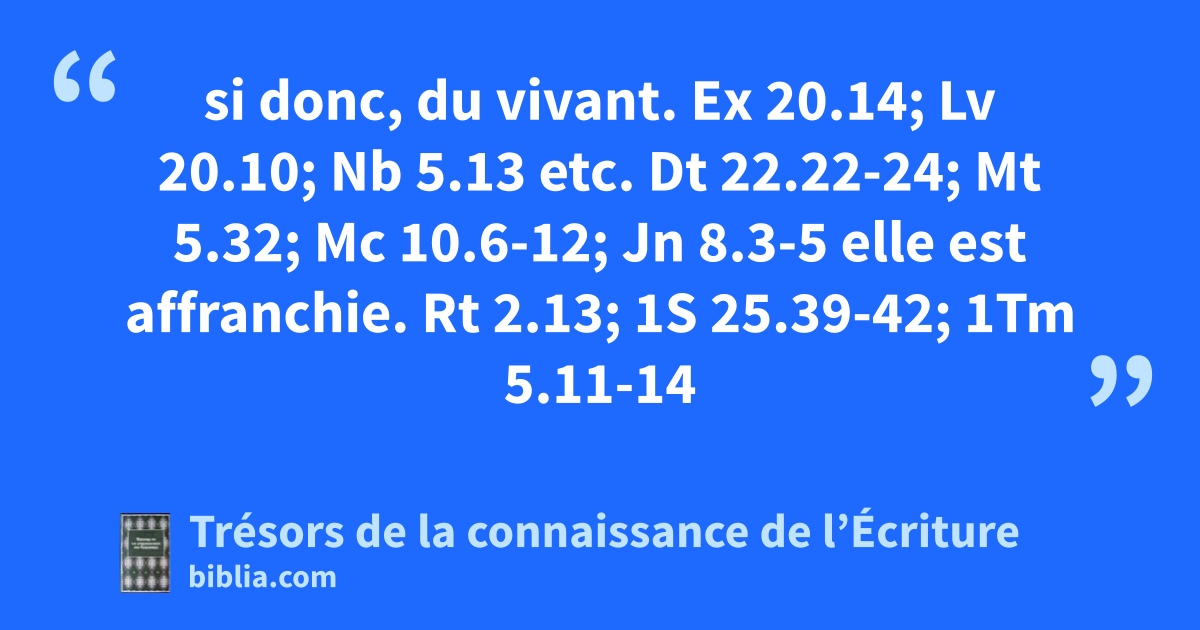 si donc, du vivant. Ex 20.14; Lv 20.10; Nb 5.13 etc. Dt 22.22-24; Mt 5.32; Mc 10.6-12; Jn 8.3-5 elle est affranchie. Rt 2.13; 1S 25.39-42; 1Tm 5.11-14
