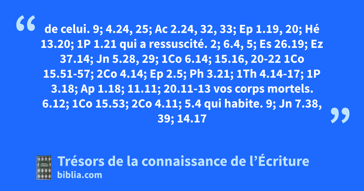 de celui. 9; 4.24, 25; Ac 2.24, 32, 33; Ep 1.19, 20; Hé 13.20; 1P 1.21 qui a ressuscité. 2; 6.4, 5; Es 26.19; Ez 37.14; Jn 5.28, 29; 1Co 6.14; 15.16, 20-22 1Co 15.51-57; 2Co 4.14; Ep 2.5; Ph 3.21; 1Th 4.14-17; 1P 3.18; Ap 1.18; 11.11; 20.11-13 vos corps mortels. 6.12; 1Co 15.53; 2Co 4.11; 5.4 qui habite. 9; Jn 7.38, 39; 14.17