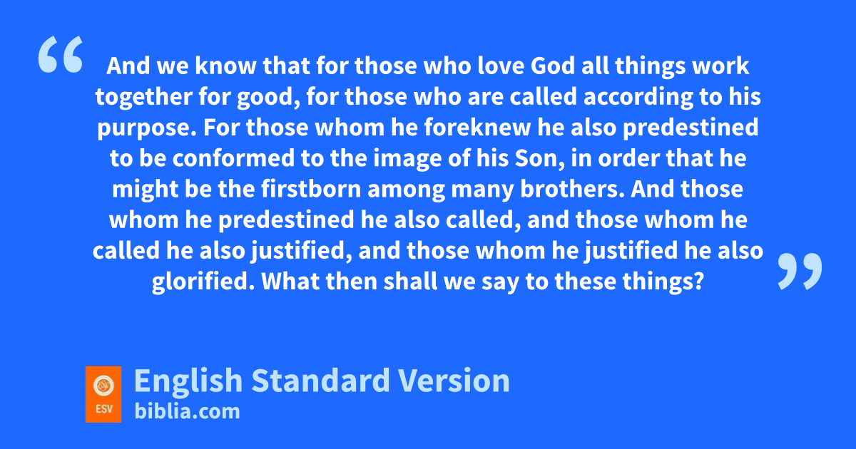 26 Likewise the Spirit helps us in our weakness. For bwe do not know what to pray for as we ought, but cthe Spirit himself intercedes for us with groanings too deep for words. 27 And dhe who searches hearts knows what is ethe mind of the Spirit, because7 the Spirit fintercedes for the saints gaccording to the will of God. 28 And we know that for those who love God all things work together hfor good,8 for ithose who are called according to his purpose. 29 For those whom he jforeknew he also kpredestined lto be conformed to the image of his Son, in order that he might be mthe firstborn among many brothers. 30 And those whom he predestined he also called, and those whom he called he also njustified, and those whom he justified he also oglorified.